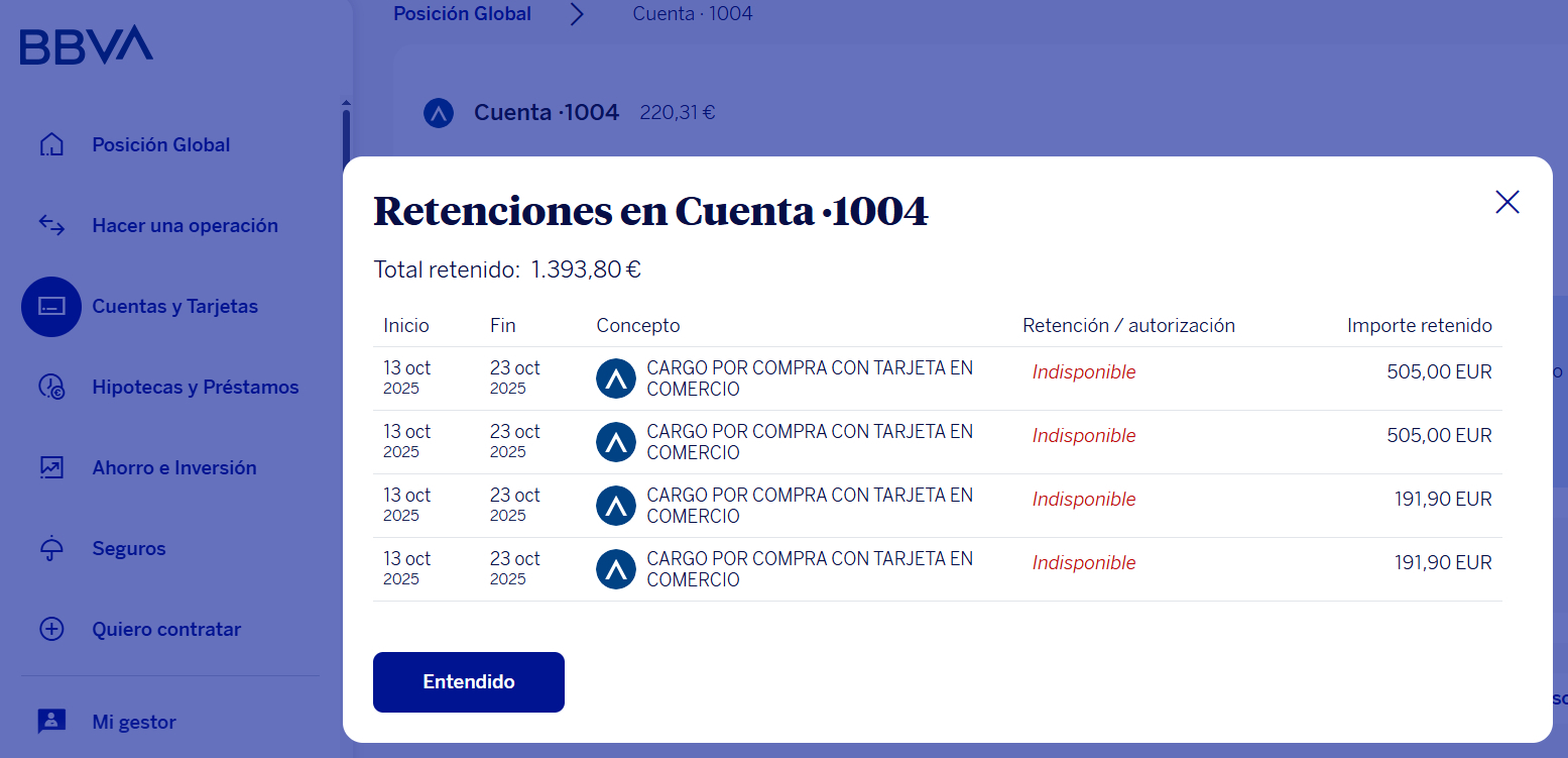 Peor aún, nos sacaron 1300 € de nuestra cuenta conjunta. Ver archivo adjunto. Ayer (13/10/25) estaba una retención. Pero ahora (14/10/25)  es un débito a pesar de nuestra denuncia del día anterior.